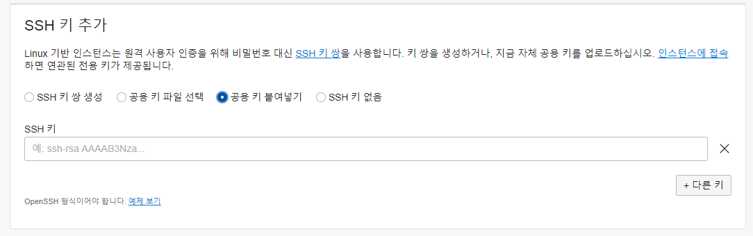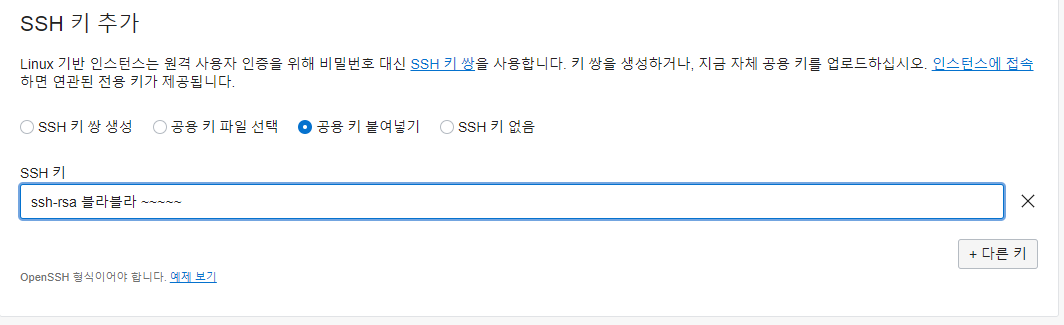 7. 아까 복사한 ssh-rsa 로 시작하는 텍스트를 ssh키라는 부분에 복사붙여넣기 한다.