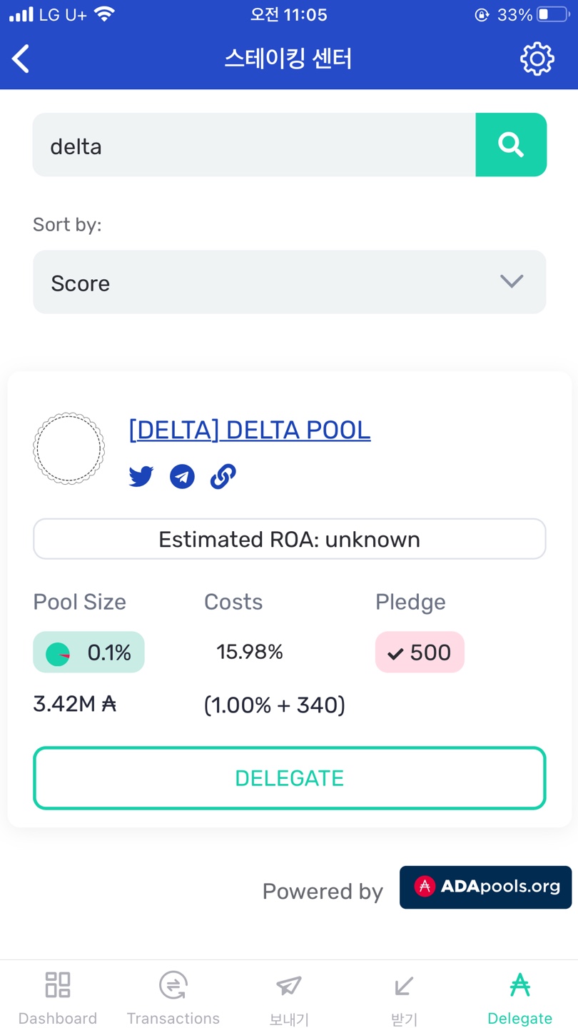 원하는 풀을 선택한후 DELEGATE를 클릭후 지불암호를 입력하면