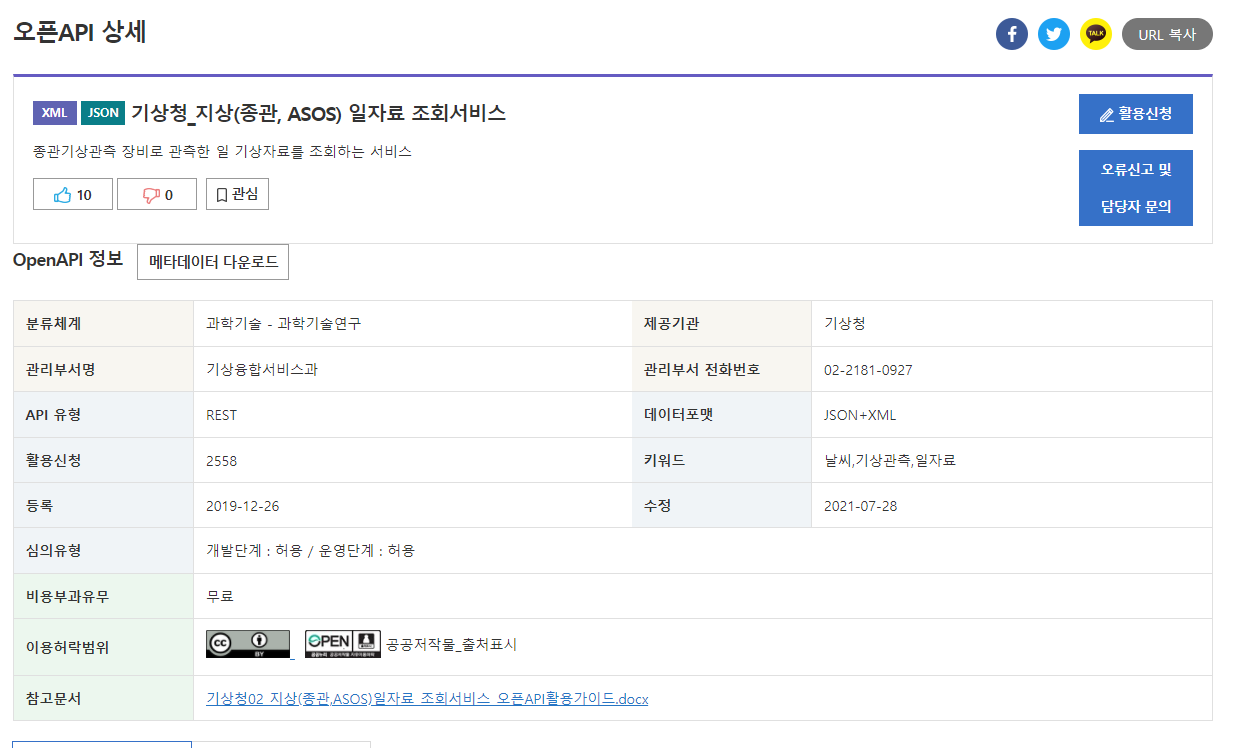 data.go.kr 에서 "기상청_지상(종관, ASOS) 일자료 조회서비스" 검색한다음 활용 신청을 합니다.