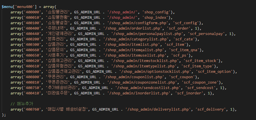 array('400760', '매입사별 배송비설정', G5_ADMIN_URL . '/shop_admin/deliverylist.php', 'scf_delivery', 1),