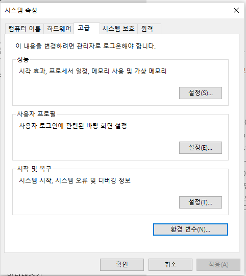 - 아래 사진과 같이 환경 변수를 클릭합니다.