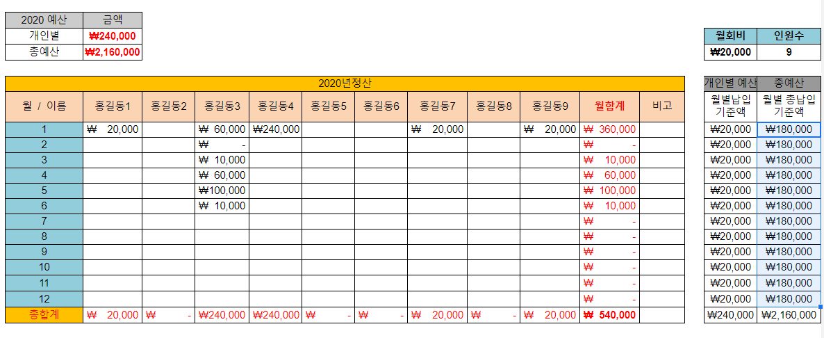 [구글 스프레드시트] 모임회비 양식